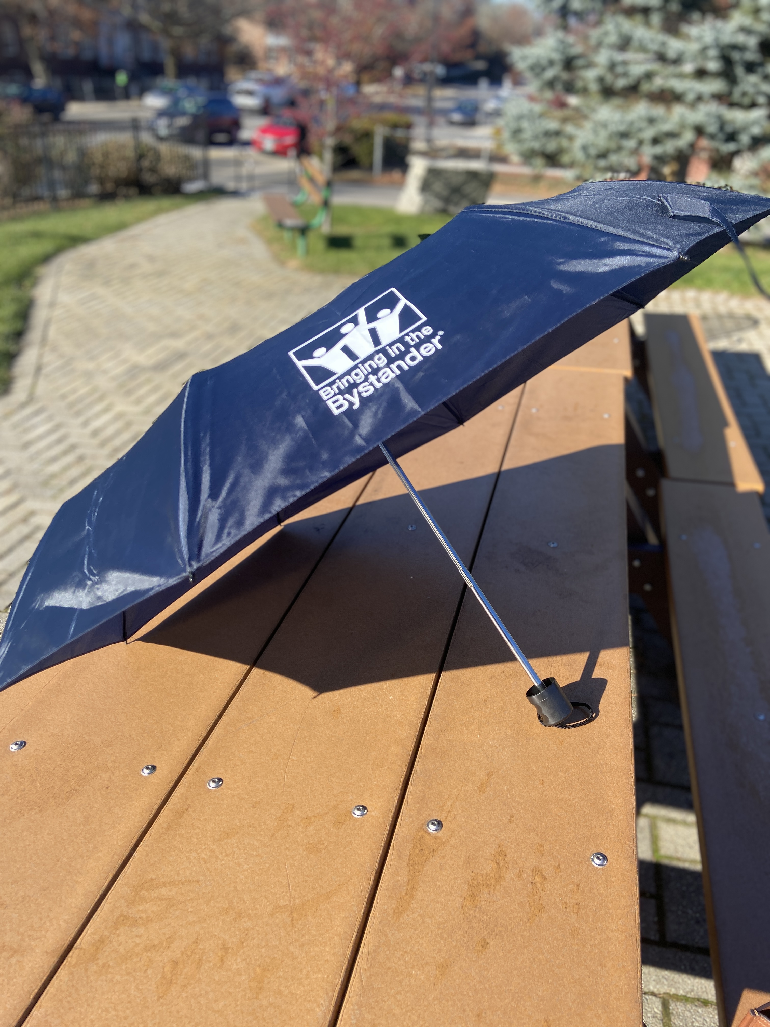 Have your audience carry the message of bystander intervention with them, rain or shine! Our high-quality Bringing in the Bystander® umbrella features the official BITB logo, combining durability and style with your community's commitment to creating safer spaces.